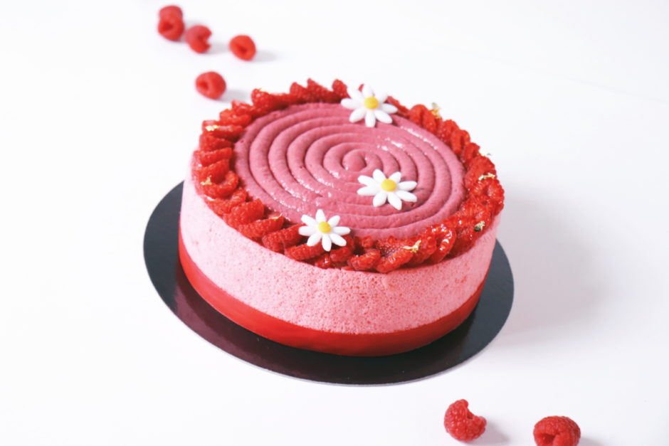 Sortir le crémeux Ruby-framboise du frigo, le détendre un peu afin qu’il soit lisse et le dresser en tourbillon à l’aide d’une poche munie d’une douille unie de taille moyenne. Pensez à bien laisser 1 cm de libre sur les bords afin de pouvoir par la suite disposer les demies framboises fraîches.