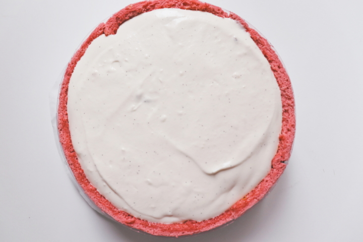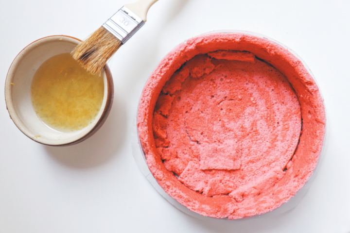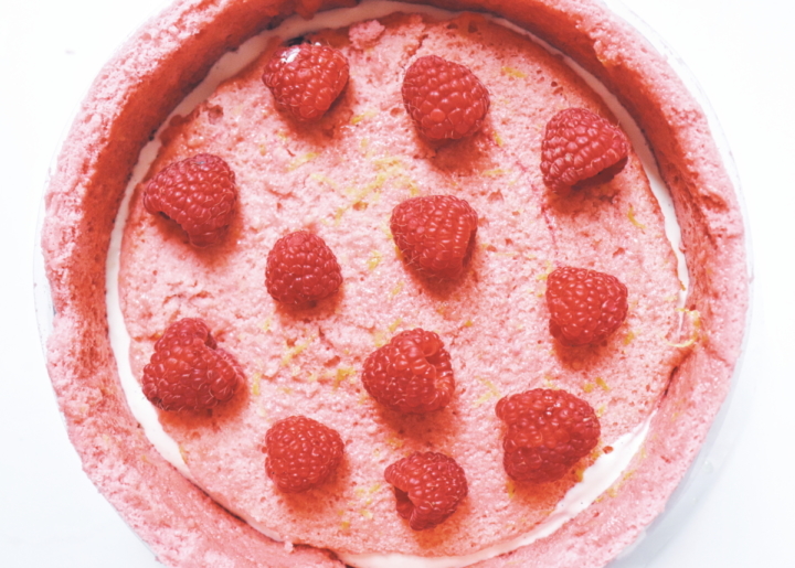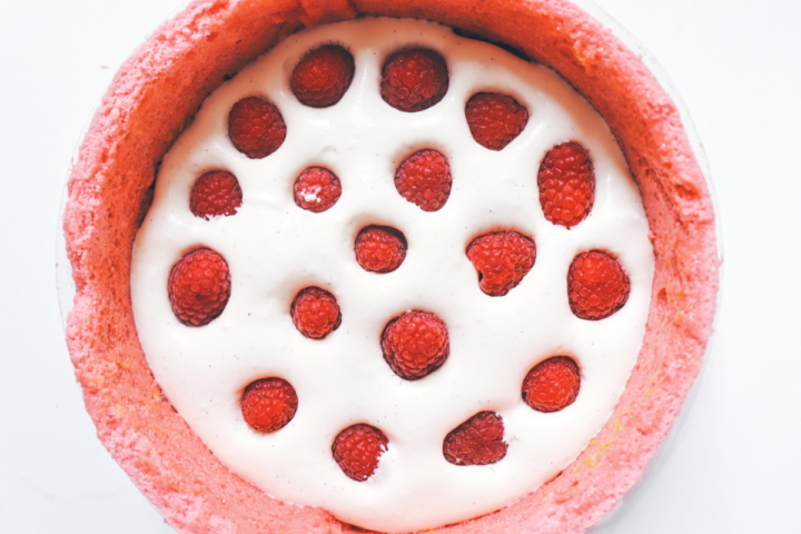 Déposer le second disque de biscuit, l’imbiber à son tour du sirop citron. Déposer à nouveau des framboises puis couler le reste de mousse vanille, à ras-bord.