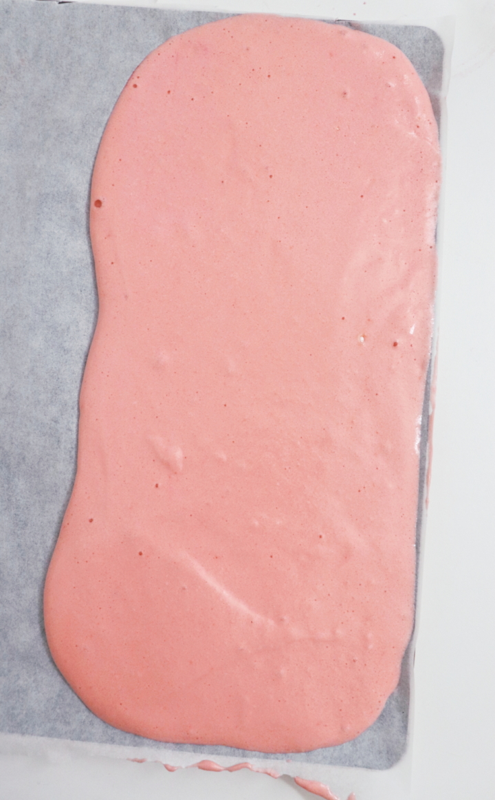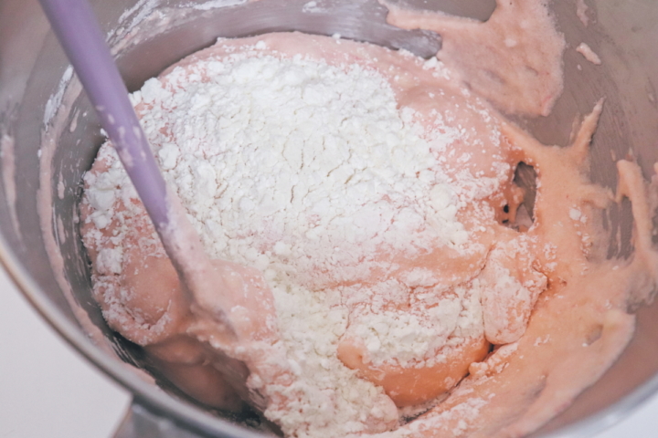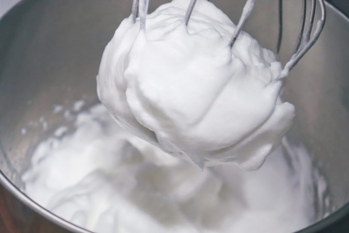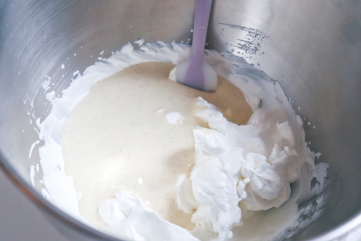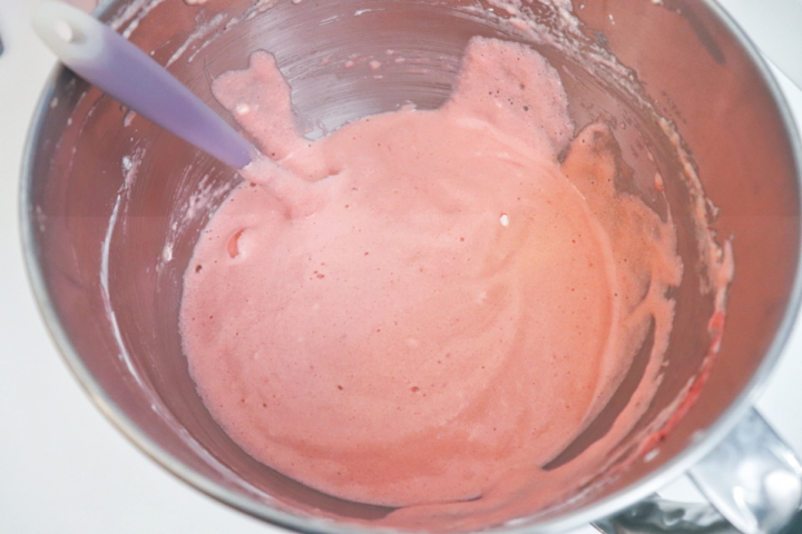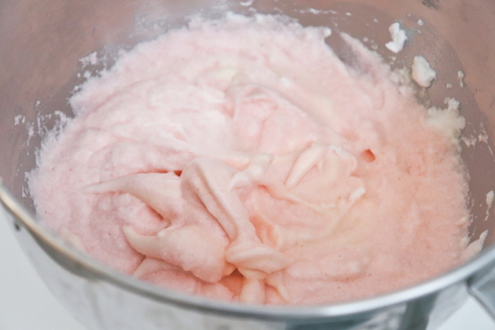 Monter les blancs d’oeufs en les serrant avec le sucre en poudre lorsqu’ils commencent à mousser. Ajouter les jaunes et une pointe de colorant (je vous conseille d’en mettre peu afin d’obtenir une couleur pastel, je trouve cela plus joli) et mélanger brièvement.