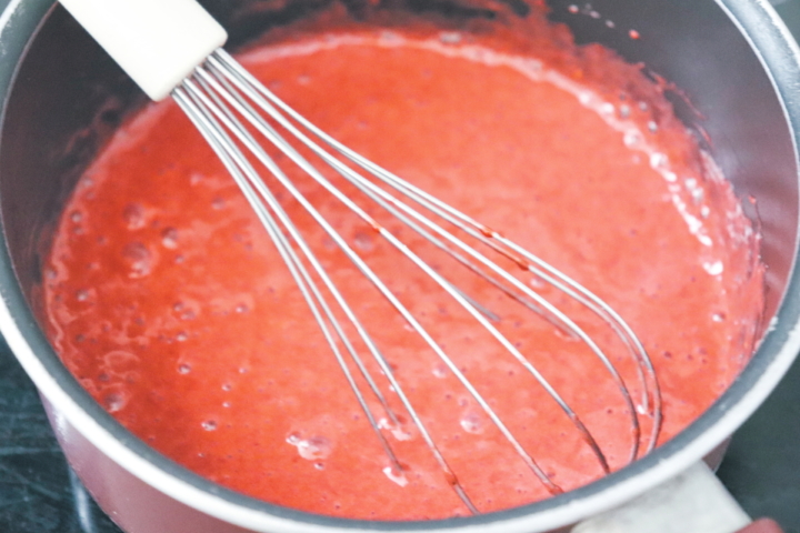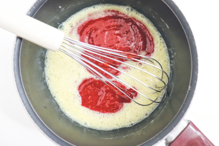 Chauffer la purée de framboise avec le jus de citron et aux premiers bouillons, en verser une partie sur l’oeuf battu avec le sucre, en fouettant. Remettre le tout dans la casserole et cuire à feu moyen jusqu’aux premiers bouillons.