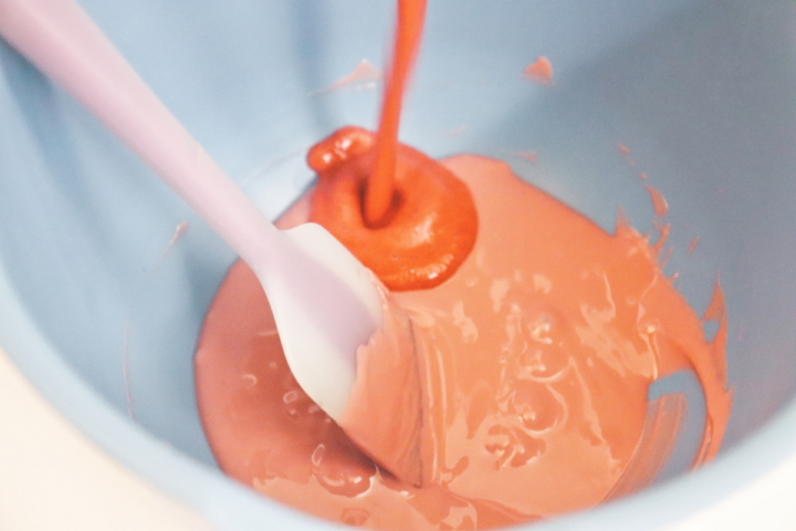 Hors du feu, ajouter la gélatine essorée et verser progressivement, en trois fois, sur le chocolat ruby préalablement fondu.