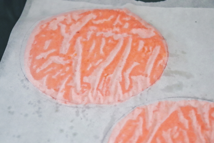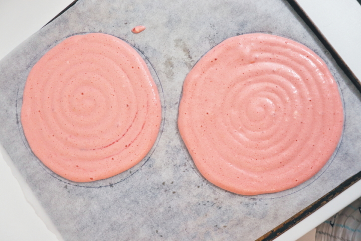 Sur une plaque de cuisson recouverte d’un papier sulfurisé, dresser deux disques de 16 cm de diamètre.