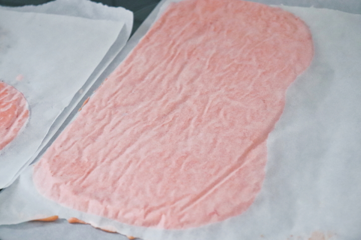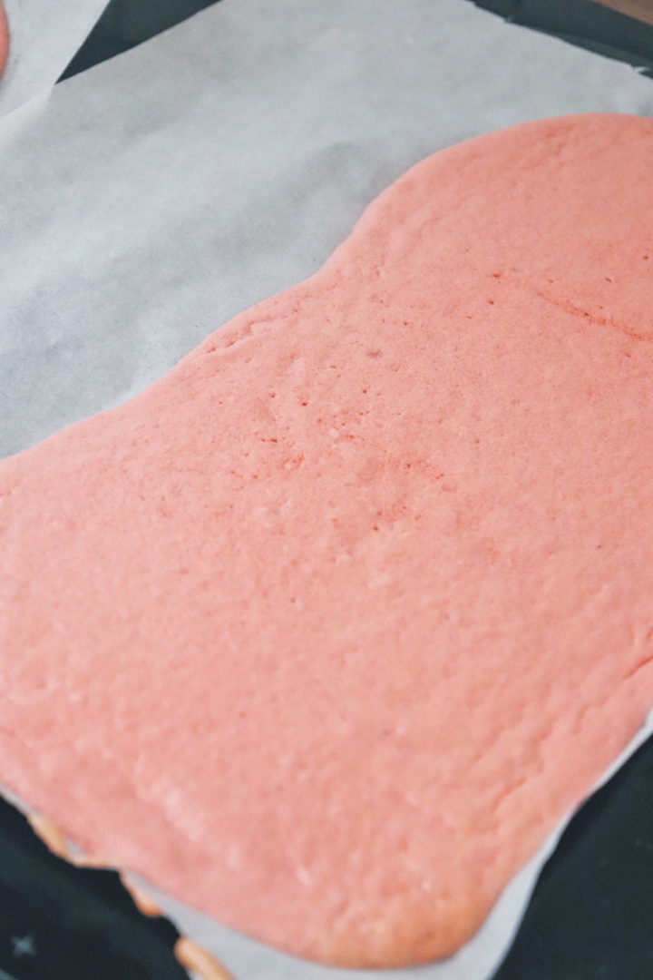 Sur une seconde plaque de 30×40, étaler à l’aide d’une spatule le reste de l’appareil seulement sur la moitié de la longueur de celle-ci (soit un biscuit d’environ 15×40 cm).